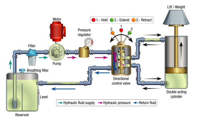 Hydraulic overcomes load force and achieves motion through “adding oil” and “releasing oil.”