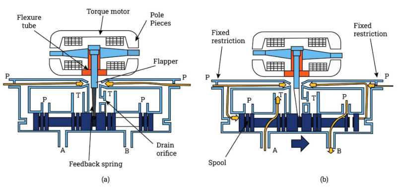 Nozzle-flapper type: Moving the flapper changes the nozzle outflow, creating a differential pressure to push the working valve spool.